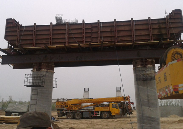 蓋梁模板采用托架法現(xiàn)澆,模板采用大塊組合鋼模,利用預(yù)留的孔洞安裝托架縱橫梁,在橫梁上拼裝好底模。然后先綁扎蓋梁鋼筋,經(jīng)監(jiān)理工程師檢查合格,再拼裝兩側(cè)的模板。