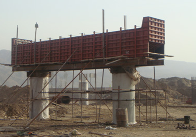 蓋梁模板采用托架法現澆,模板采用大塊組合鋼模,利用預留的孔洞安裝托架縱橫梁,在橫梁上拼裝好底模。然后先綁扎蓋梁鋼筋,經監理工程師檢查合格,再拼裝兩側的模板。